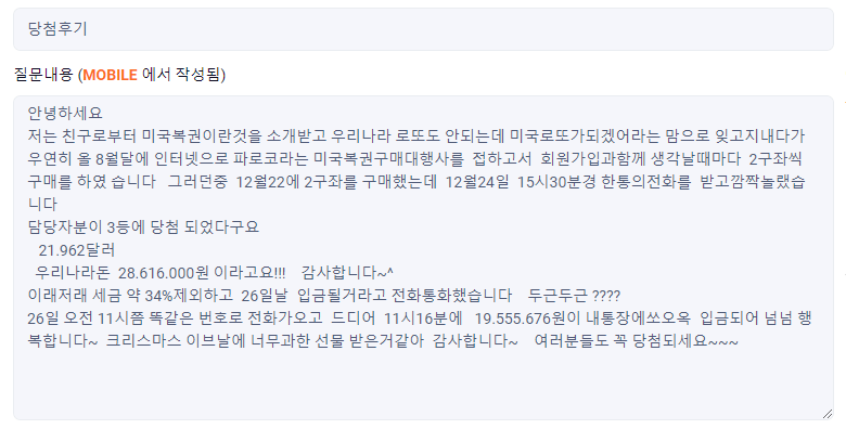 미국로또 최고의 명당 저희 "파로코"를 믿고 사랑해주신 덕분에 다시한번 3등 당첨자를 탄생시켰습니다.