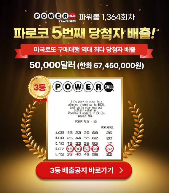저희 파로코에서 5번째 3등 파워볼 1364회차 당첨자가 배출되었습니다.